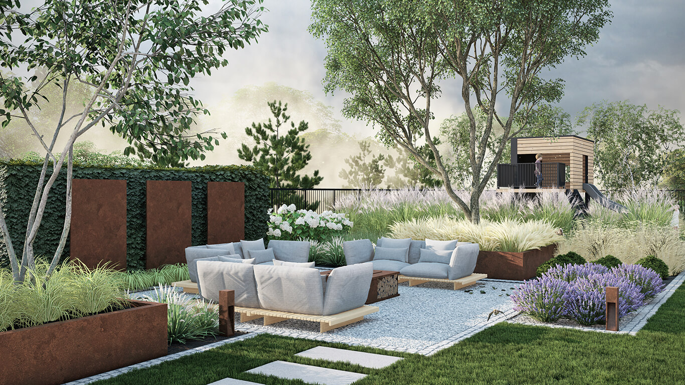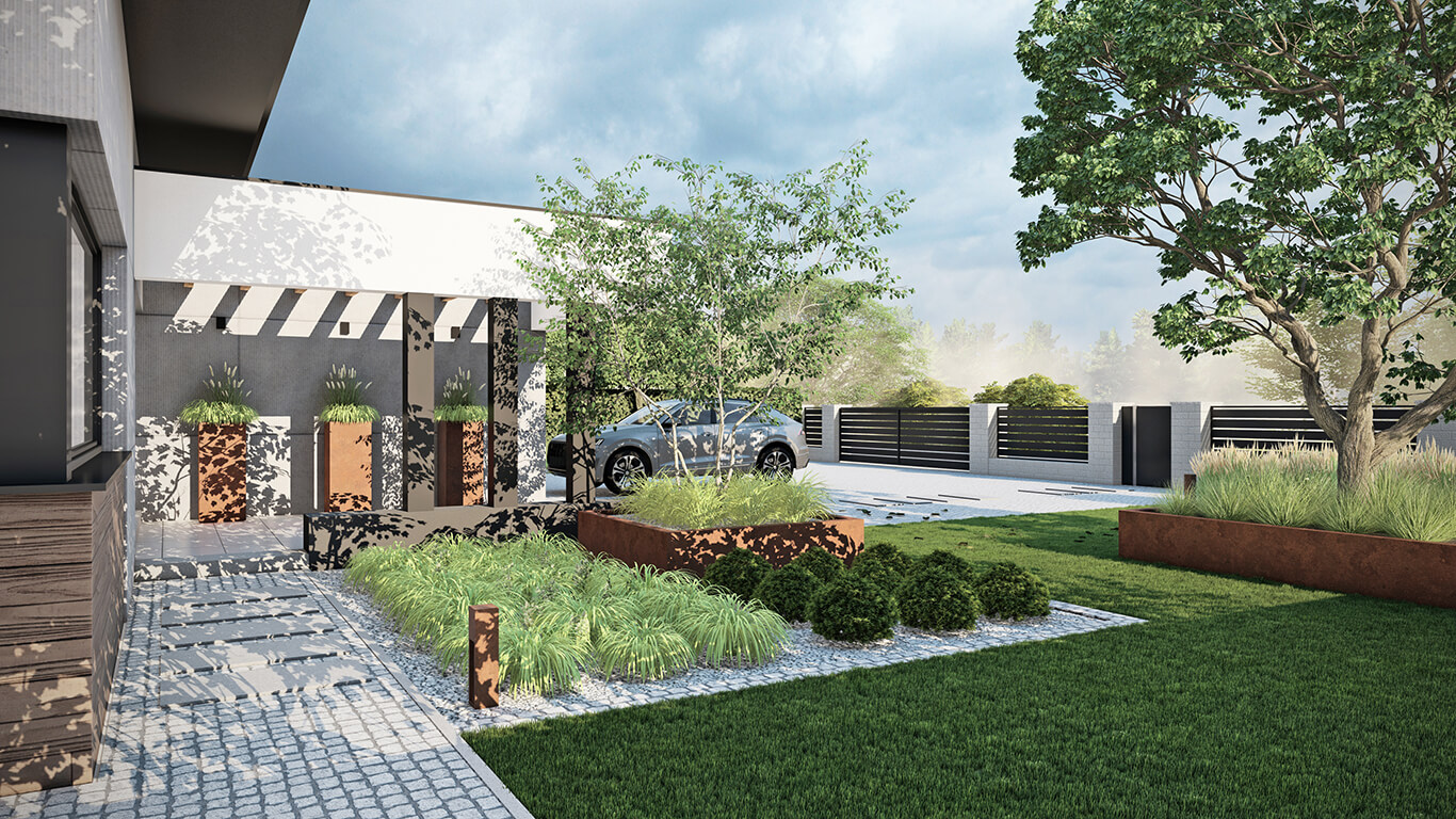 Ogród został zaprojektowany dla zapracowanej rodziny z małymi dziećmi. Cechą charakterystyczną projektu są elementy małej architektury wykonane ze stali corten, m.in. fontanna, palenisko, czy podwyższone rabaty z drzewami, które wyróżniają się na tle roślin i architektury domu. Projekt uwzględnia możliwości czasowe właścicieli, a odpowiedni dobór gatunków roślin czyni go prostym w pielęgnacji.