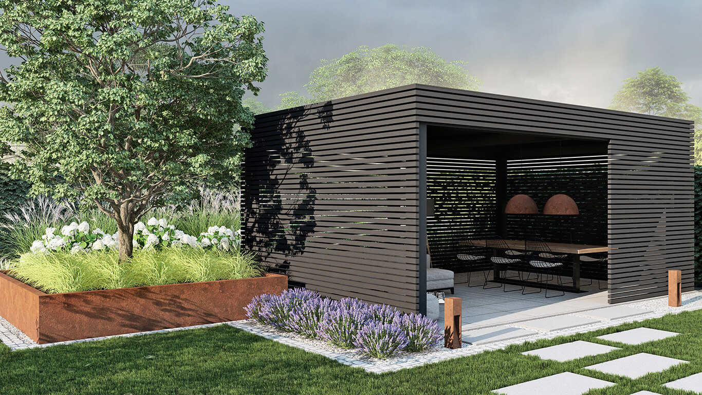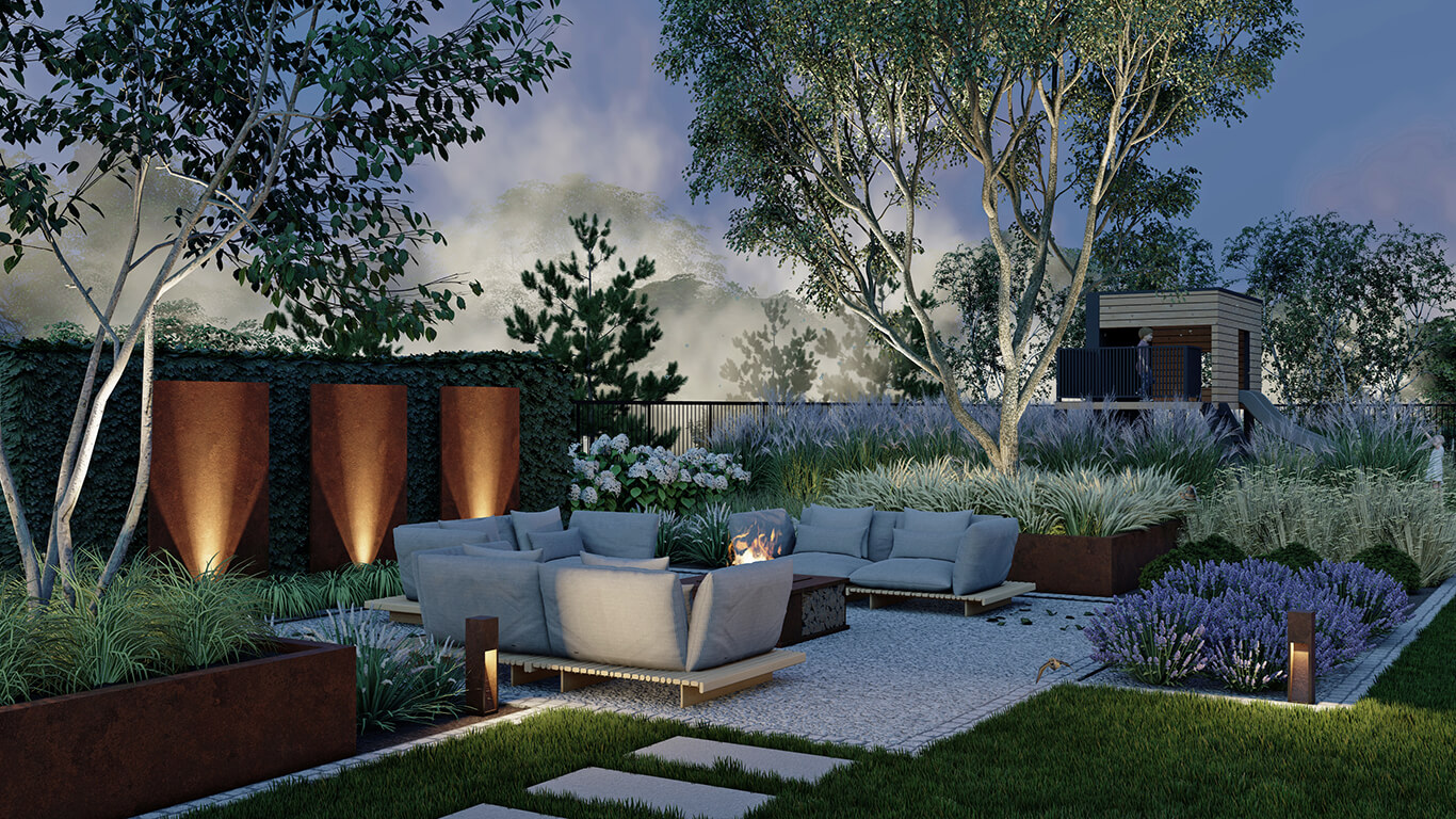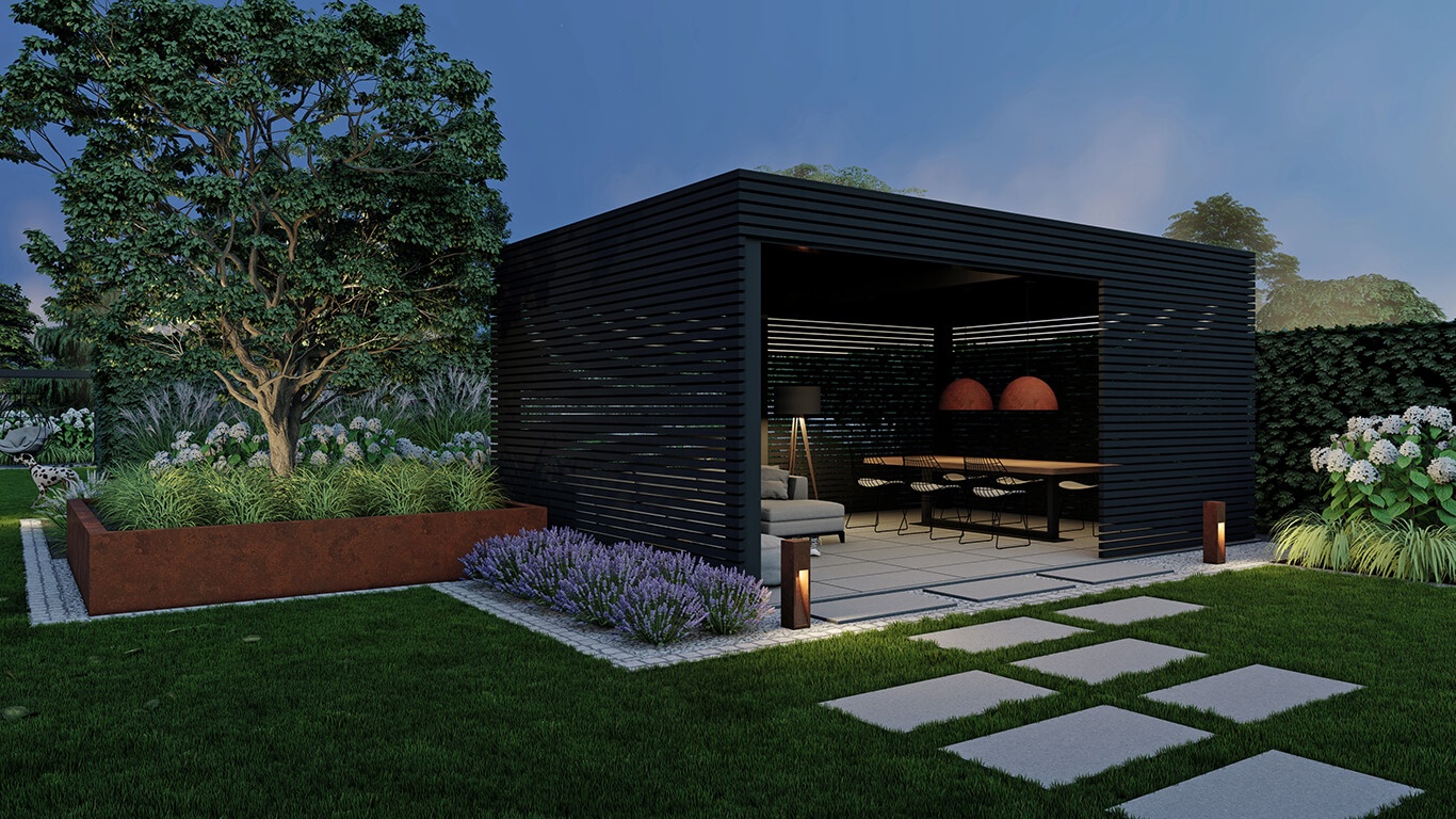 różnorodność stref aktywności w ogrodzie: strefa tarasowa z wygodnymi sofami, nowoczesna altana, strefa z paleniskiem, pergola z hamakiem, plac zabaw dla dzieci i mały warzywnik w skrzyniach corten,