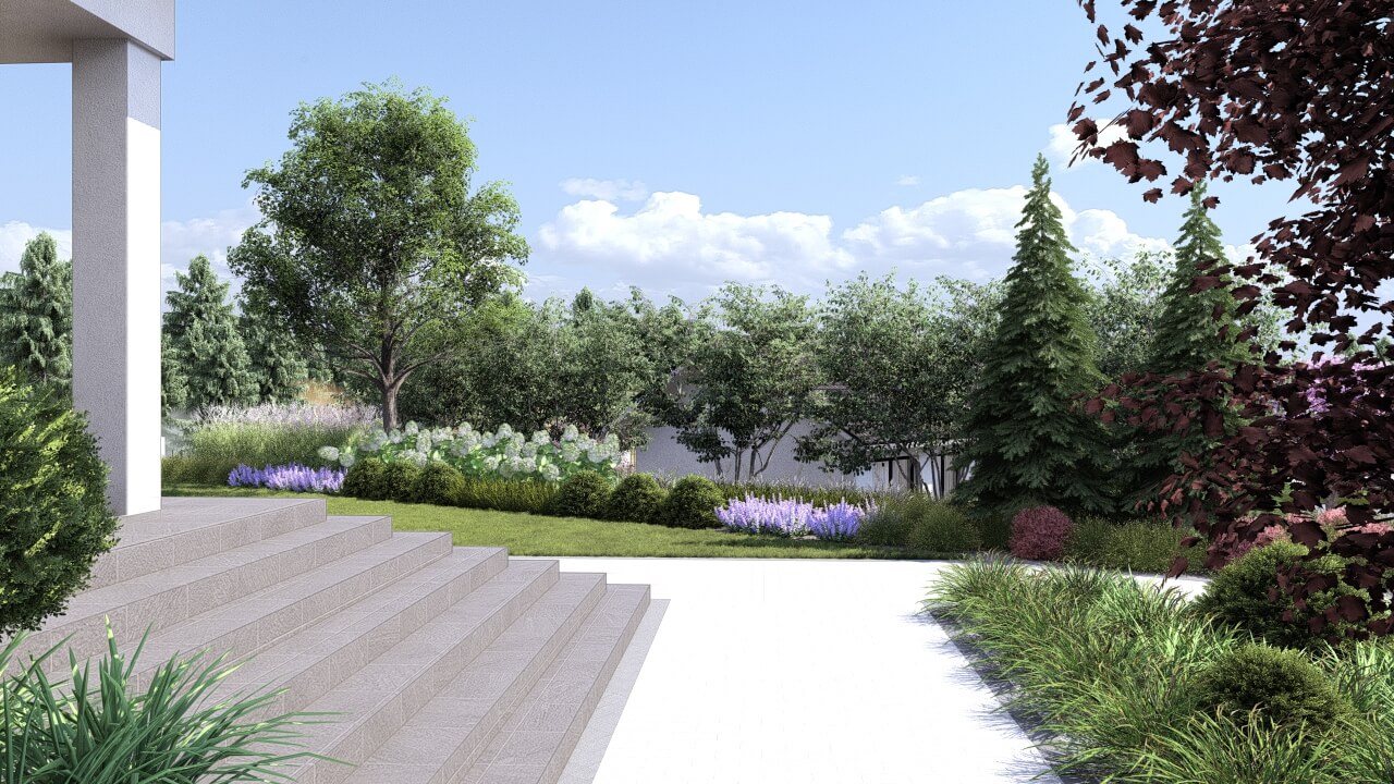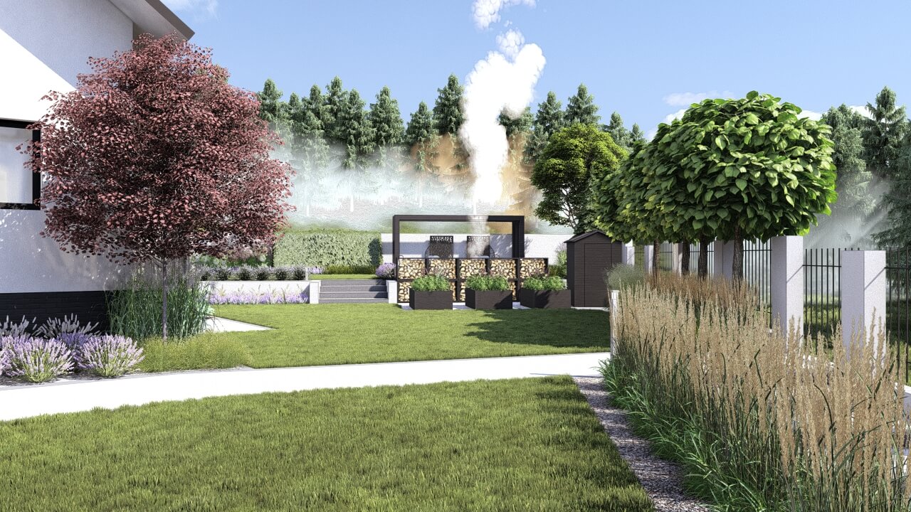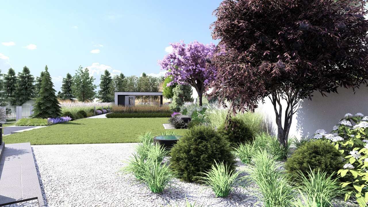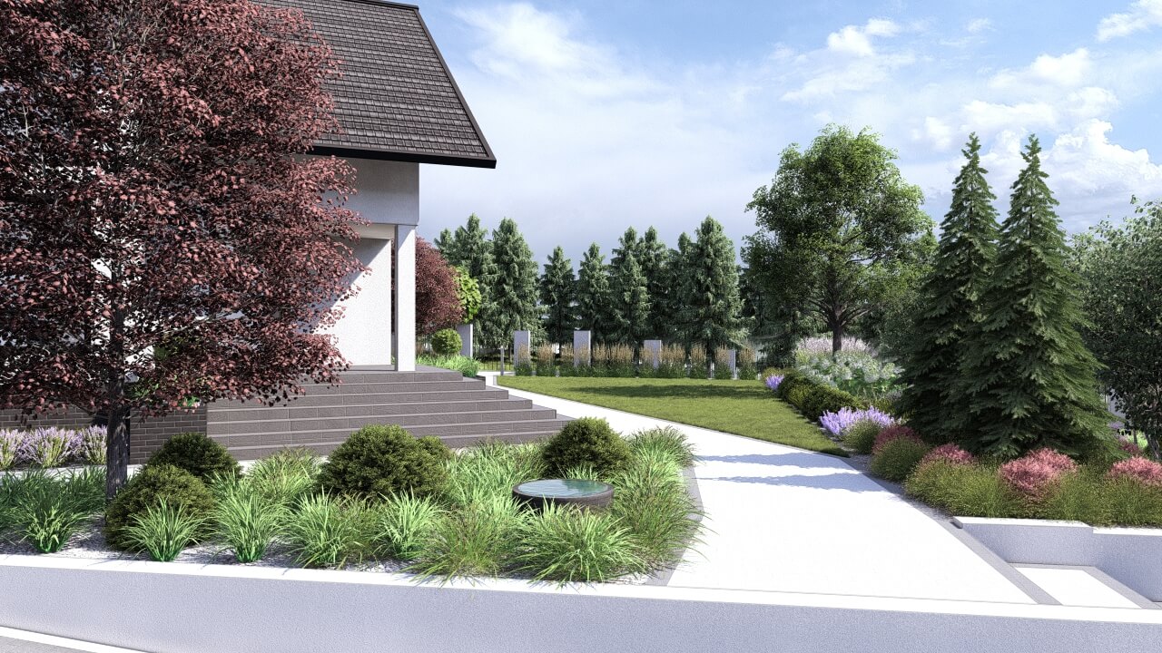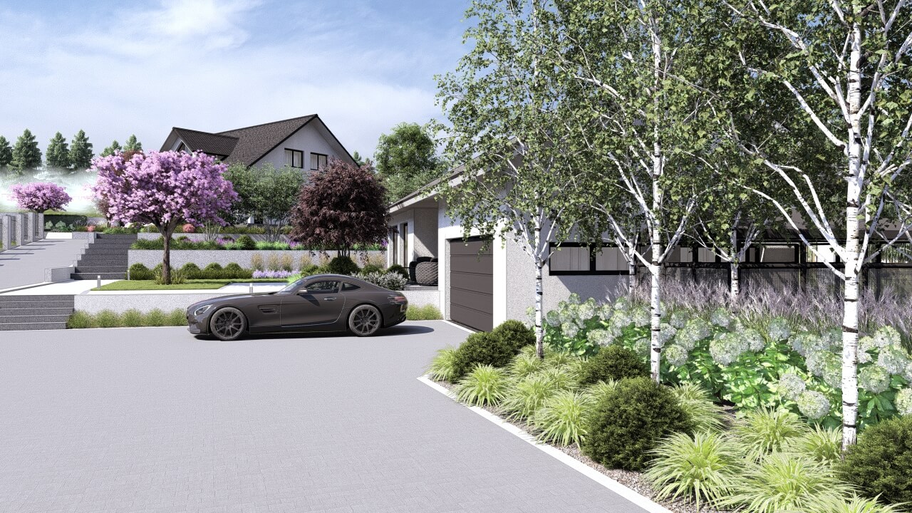 Lokalizacja domu na terenie z dużymi różnicami wysokości terenu, zniwelowanymi przez zastosowanie murków oporowych na kilku poziomach, dało niesamowite możliwości aranżacji ciekawej, wielopoziomowej przestrzeni ogrodowej. Najbardziej spektakularnym elementem tej przestrzeni jest basen, przy którym zaplanowano wygodne tarasy wypoczynkowe i nowoczesną altanę. Projekt uwzględniał także teren wokół nowopowstającego budynku biurowego z podjazdem, miejscami parkingowymi i reprezentacyjnymi rabatami.