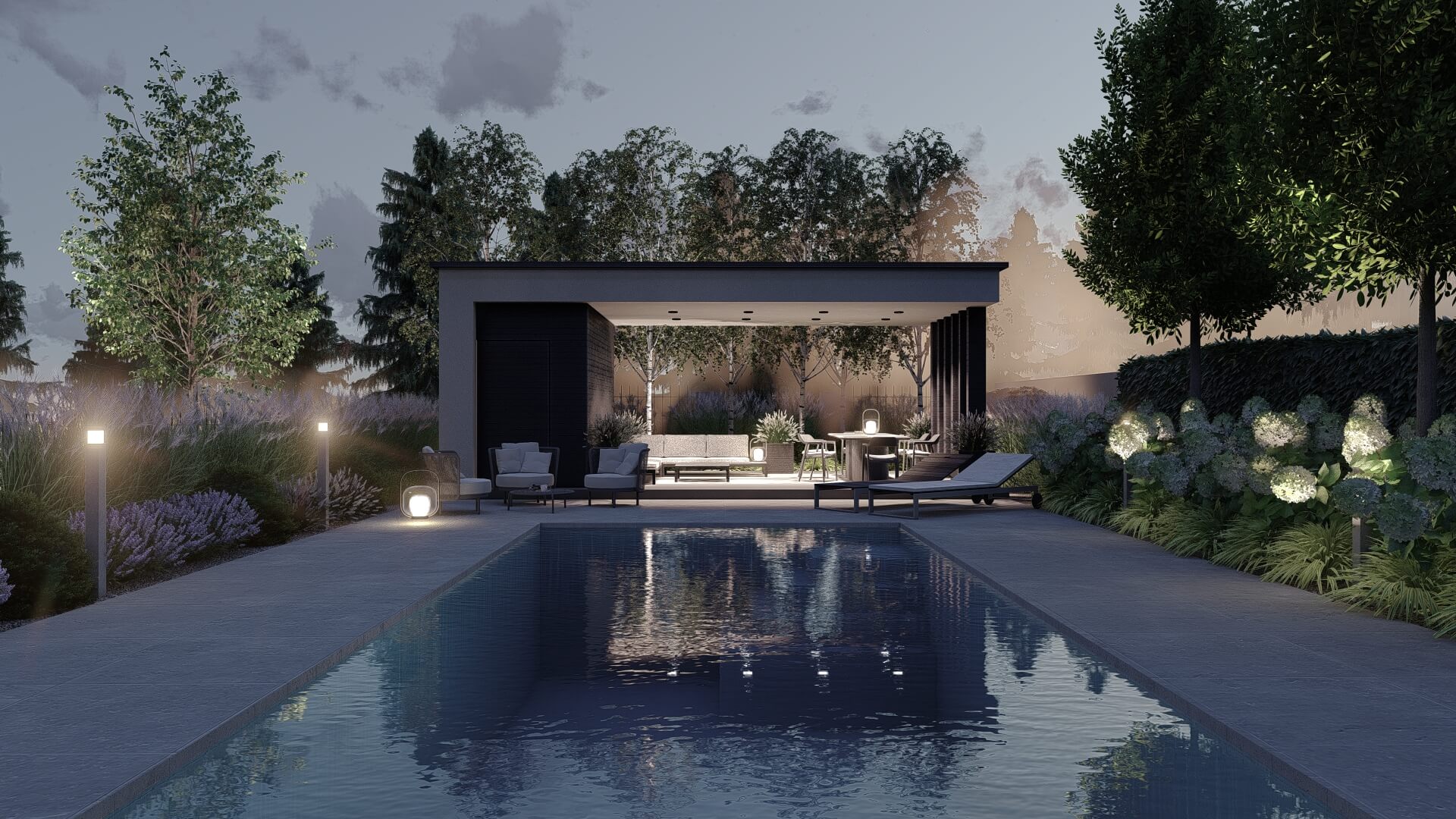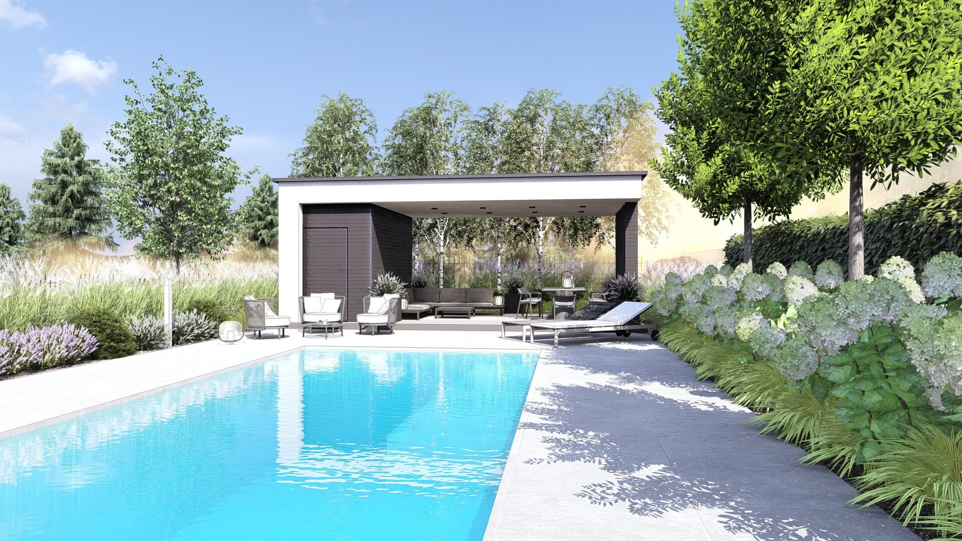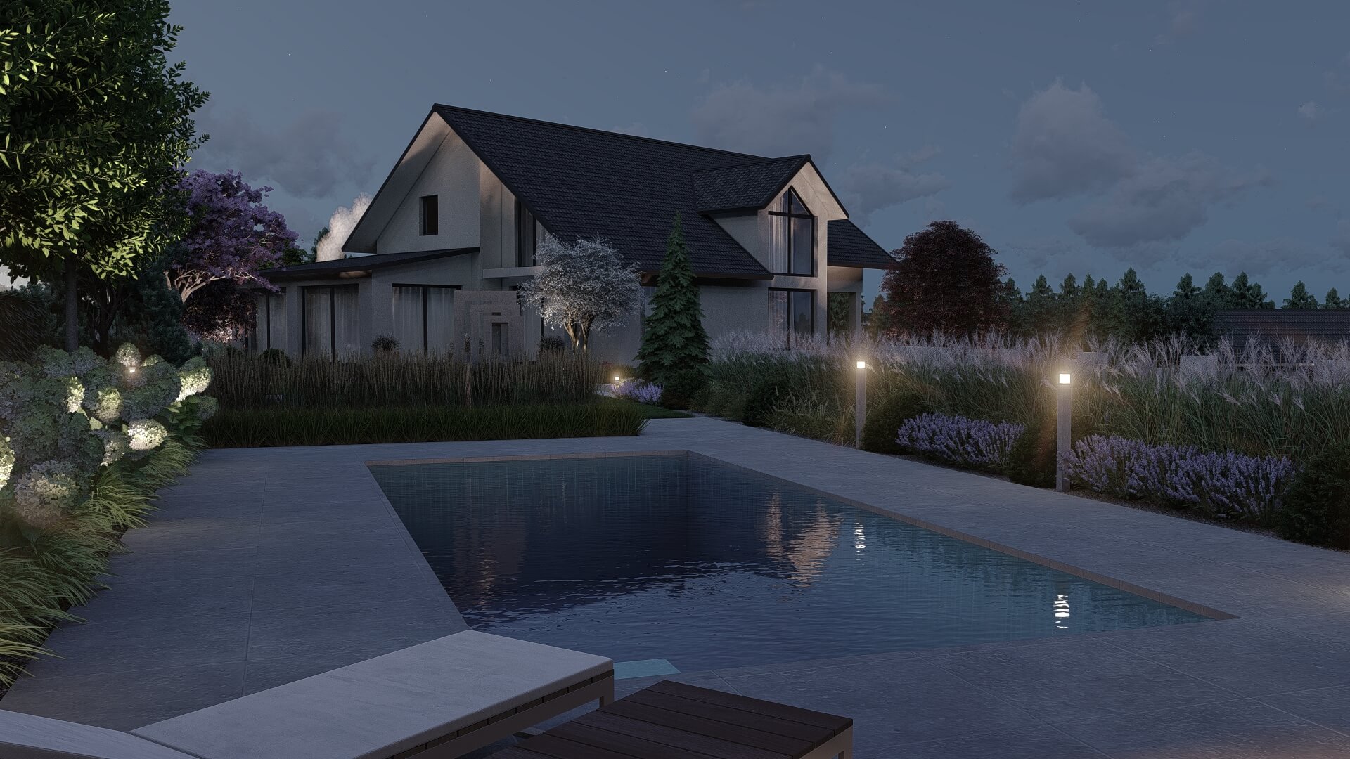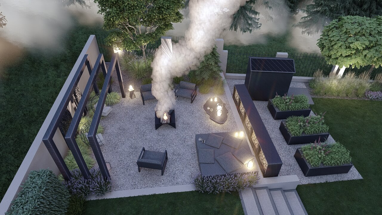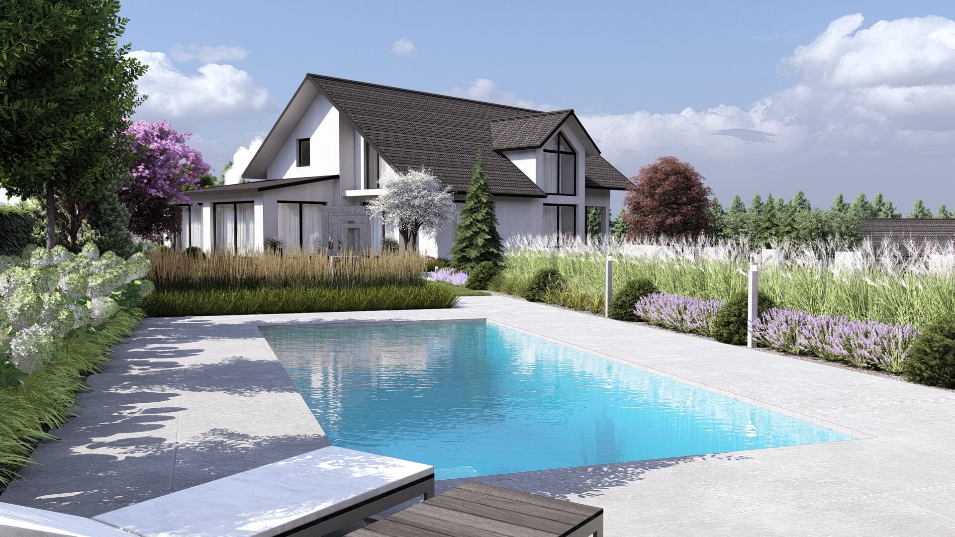 Lokalizacja domu na terenie z dużymi różnicami wysokości terenu, zniwelowanymi przez zastosowanie murków oporowych na kilku poziomach, dało niesamowite możliwości aranżacji ciekawej, wielopoziomowej przestrzeni ogrodowej. Najbardziej spektakularnym elementem tej przestrzeni jest basen, przy którym zaplanowano wygodne tarasy wypoczynkowe i nowoczesną altanę. Projekt uwzględniał także teren wokół nowopowstającego budynku biurowego z podjazdem, miejscami parkingowymi i reprezentacyjnymi rabatami.
